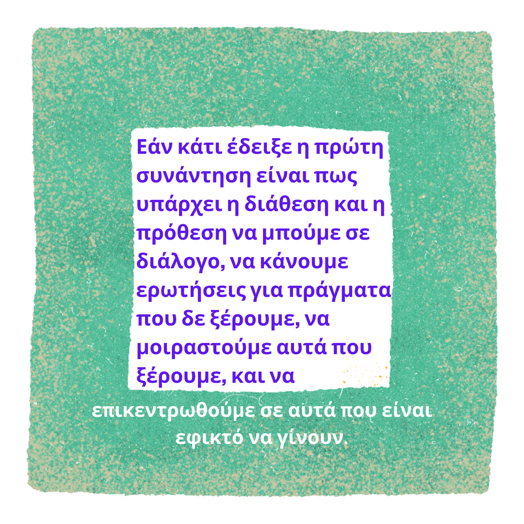 ΕΒΕΛΙΝΑ ΑΡΑΠΙΔΗ, ΗΘΟΠΟΙΟΣ, ΑΜΚΕ ΕΥΤΟΠΙΑ“Η βάση των συναντήσεων ήταν ο διάλογος. Κατά βάση έβαζα σε λέξεις επιθυμίες, απορίες, "σκόρπιες σκέψεις" ενίοτε για επόμενα έργα ή για το ταξίδι έργων και συνεργασιών που ήδη υπάρχουν. Βάζοντας σε λέξεις τα παραπάνω και με την mentorα να καθοδηγεί ψύχραιμα την συζήτησή μας μέσα από απλές ερωτήσεις, είδα τον εαυτό μου να διαμορφώνει και να προτεραιοποιεί τα επόμενα βήματά μου. Με βοήθησε επομένως ιδιαίτερα στην οργάνωση της σκέψης και την ψύχραιμη διαχείριση παράλληλων κινήσεων (προώθηση, αποστολή αιτήσεων, γενικές πρόβες παράστασης,..)