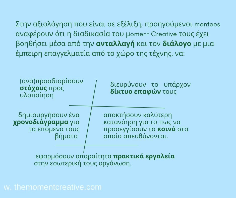 Απευθυνόμενο σε δημιουργούς από διαφορετικά καλλιτεχνικά πεδία, και βασισμένο στα χρόνια δουλειάς και διεθνών συνεργασιών της Κωνσταντίνας Γεωργίου, το πρόγραμμα επαγγελματικής ανάπτυξης του μoment Creative προσφέρει γνώση και εμπειρία τόσο σε καλλιτέχνες από διαφορετικά πεδία, όσο και σε ανεξάρτητους παραγωγούς.